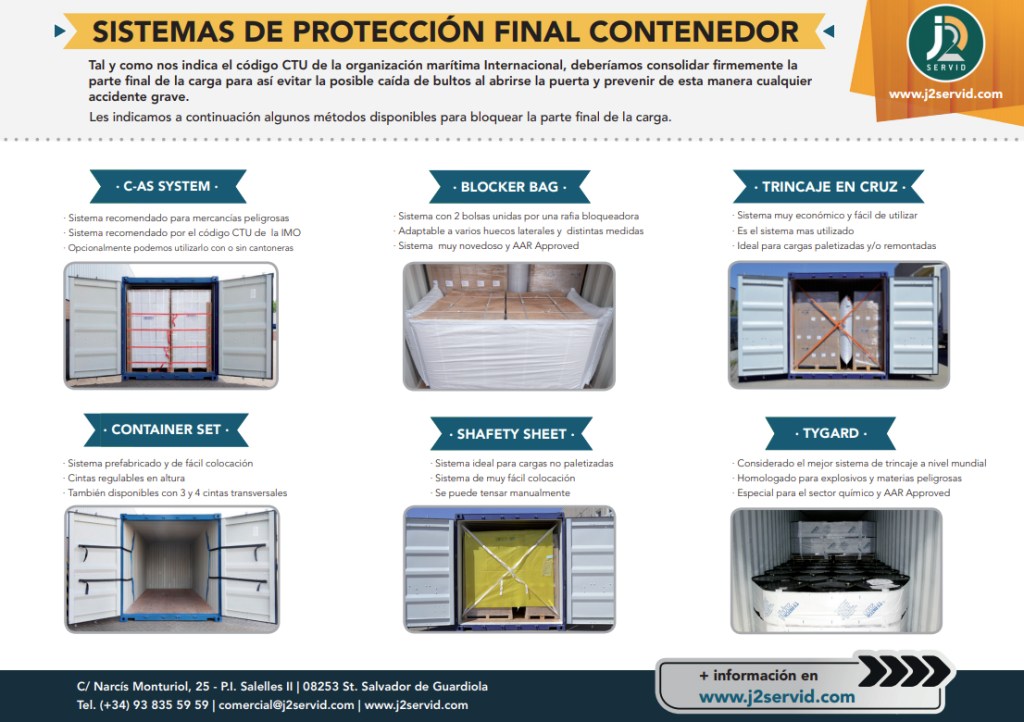 La organización marítima internacional nos dice que debemos consolidar firmemente la parte final de la carga para evitar accidentes. En J2 Servid, tienen distintos sistemas que nos van a ayudar a sujetar las cargas: